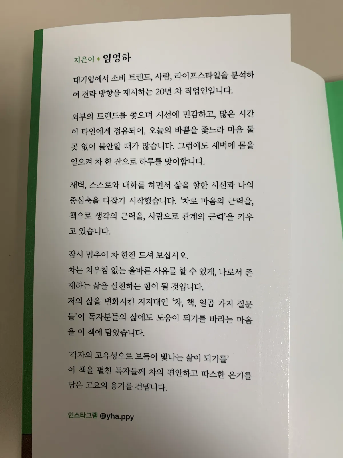 "책을 읽다 보면 고민이 해결되기도, 흐트러진 마음을 다잡기도, 우울한 마음에 뭔가 하고 싶다는 꿈틀거림이 생기기도 했다. 책 속에서 발견하는 영감을 기록하고 공유하면서 내면이 조금씩 단단해졌다."